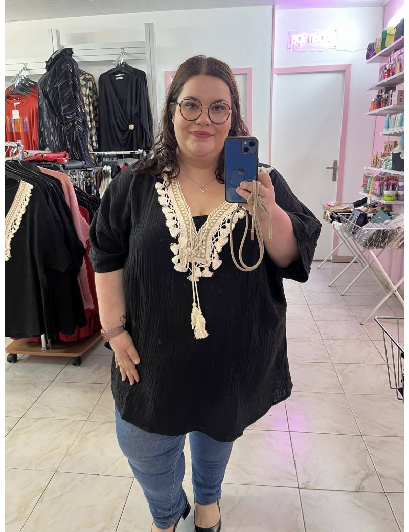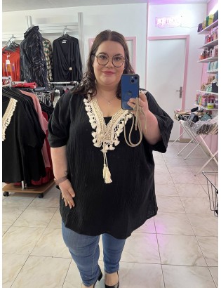 Blouse en gaze de coton, col dentelle et noeud, idéale pour le printemps / été