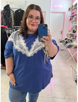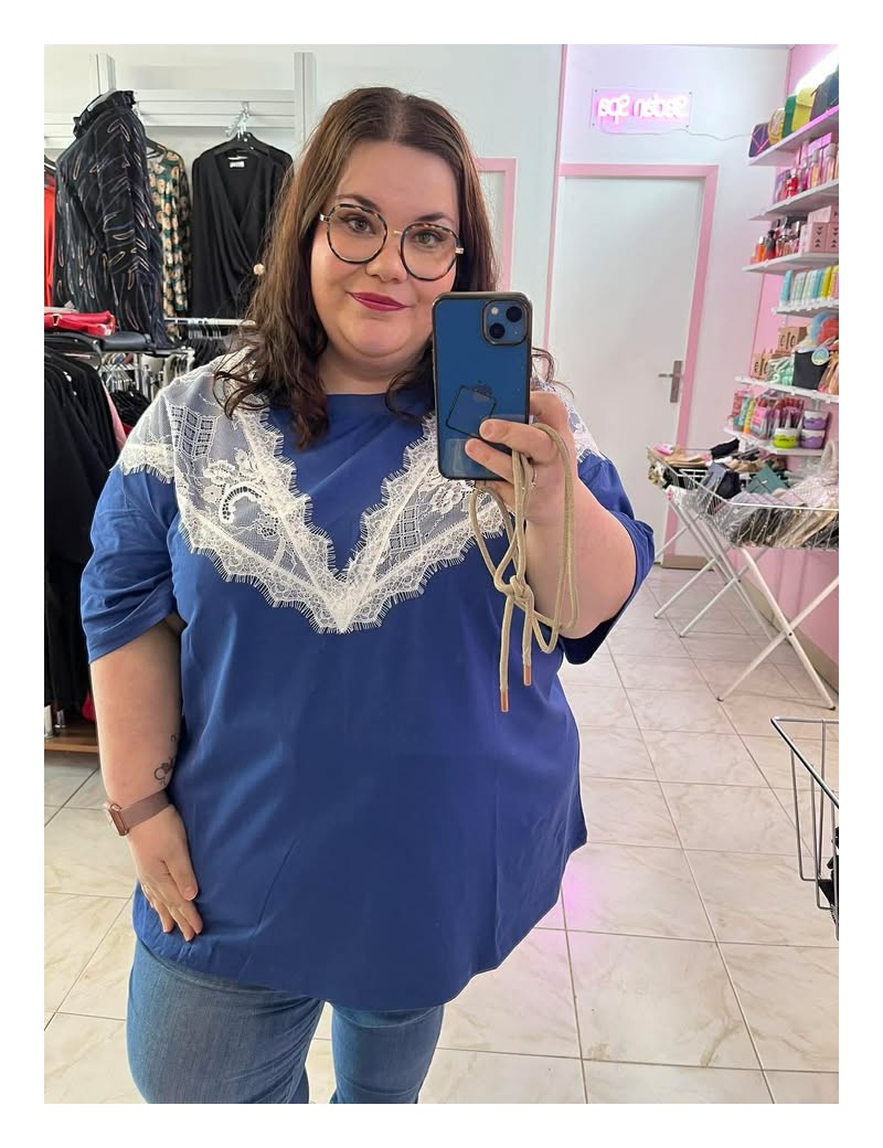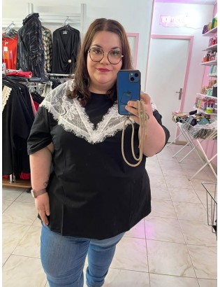 Top en coton stretch à col rond avec dentelle contrastante, idéal pour le printemps / été